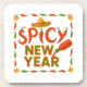 Celebrate the New Year with this fun festive holiday coasters to serve your guests drinks or, gift a friend or family member for their new years' party. Delight them with this whimsical design of flame emojis bordering red and green chili peppers that spell out "Spicy New Year" with a sombrero and hot sauce pouring out over the year. Your friends will get a kick out of these coasters when you use them to serve drinks throughout the year.