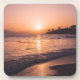 Foto impressionante de um pôr do sol sobre uma praia deserta com montanhas e palmeiras à distância.