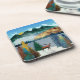 Uma bela paisagem com cores e texturas únicas mostrando uma paisagem de montanha e lago e uma floresta multicolorida com um sol ascensão e um alce em tons de azul, verde, ouro e magenta.