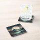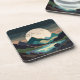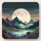 Uma paisagem abstrato de uma enorme superlua em uma cena de lago montanhês com um bando de pássaros em texturas ousadas e tons escuros de marrom, bege, bronzeado, azul, ciano e preto.