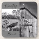 Aproveite esta colagem de imagens rústicas em preto e branco: um trator antigo, uma porta de celeiro de meteoros, e um pico de um telhado de celeiro. Imagens definidas com um fundo de cinza escuro e as palavras "País" e "Início" em script preto no canto superior esquerdo e no canto inferior esquerdo.