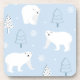 Ursos polares fofinhos cercados por árvores de Natal e flocos de neve contra fundo azul-gelo