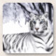 Tigre branco bonito com listras pretas e olhos azuis que encontram-se na neve.