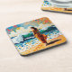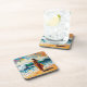 An oceanic themed coaster. A beautiful ai illustration done in an oil painting impasto style. A woman walking on the beach with an abstract mosaic vibrant colorful style.