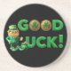 Um Leprechaun engraçado com um terno verde com barba vermelha e uma moeda de ouro na mão lhe dá boa sorte!
