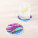 Uma paisagem abstrato colorida de colinas e um oceano de cores rosa, roxo, azul, verde e ciano.