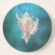 Uma concha cor-de-rosa delicadamente rosa tão realista que quase se pode ouvir o oceano, num fundo azul-oceânico vibrante.