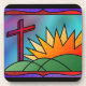 Um design de vidro manchado ilustrando a manhã da Páscoa, com uma cruz vermelha sobre colinas verdes ao lado de um nascer de sol feroz.