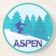 Esta porta copos caracteriza uma imagem do círculo na cerceta e no azul de um esquiador da neve da silhueta na frente dos pinheiros em uma montanha nevado. A parte inferior afligiu o texto no azul que diz ASPEN. Aperfeiçoe para o esquiador que ama as inclinações de Aspen, Colorado. a arte do *Clip usada neste design é com direitos de autor por Encore Software, Inc., que permite o uso a seus concessores. Todos os direitos reservados.
