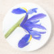 Uma fotografia de uma flor da íris roxa e amarela contra um fundo branco.