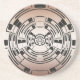 Esta porta copos contemporânea apresenta um design geométrico e abstrato sofisticado de retângulos e quadrados que se assemelha a um labirinto circular de encravamento. O padrão preto é colocado sobre um fundo gradiente de bronze.