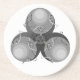 Um símbolo de risco biológico feito em tom de cinza. O círculo interno foi substituído por uma fita preta e branca. Três crânios pretos foram colocados na interseção do símbolo. Um símbolo de radiação preto e cinza é colocado no centro.