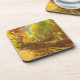 Um caminho supercrescido que percorre a floresta de pássaros em um dia ensolarado de outono. Os troncos preto e branco das árvores contrastam com folhas e gramíneas em todos os tons de ouro, de amarelo pálido a laranja profundo, iluminados pelos raios solares que passam pelos galhos.