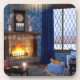 Um canto aconchegante num dia de inverno nevado, com um gato gengibre sentado olhando para o fogo brilhante. Ao redor da lareira estão cadeiras-de-braços suaves, com velas brilhantes e pilhas de livros e uma caneca a vapor para completar o conforto. Fora de um salgueiro coberto pela geada, a cobertura de faia é obscurecida pela queda da neve.