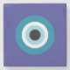 Porta copos de pedra azul com mau em negrito, gráfico de olhos e cortiça de volta.