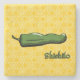 Uma pimenta verde de shishito chili, também conhecida como kwari-gochu em coreano, é decorada com padrões inspirados por designs coreanos e se senta sobre um fundo amarelo com uma versão menor do mesmo padrão e uma etiqueta de roteiro no canto. Esta pimenta suave é consumida por toda a Coreia e no Japão, crua e cozida.