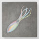Uma lula arco-íris num oceano escuro. O original é desenhado em pastéis de giz e carvão.