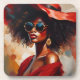 Portas copos Afro-Americanas com uma sofisticada mulher a vermelho, com um fundo vermelho e bege