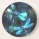 Duas libélulas transparentes, luminosas, turquesas, desenhadas artisticamente sobre fundo noturno, com algas e vagalumes luminescentes do lago. Dragonfly brilhante.
