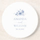 Adicione um toque de elegância do eterno à sua mesa de casamento com esta porta copos de arenito personalizada com flores azuis e poeirentas de cor aquosa. Linda e adorada com os nomes do casal e a data do casamento, esta porta copos durável e absorvente faz um favor ou uma manutenção perfeitos para os seus convidados. Ideal para temas de casamento românticos e inspirados na natureza.
