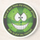 Uma porta copos bobo com um personagem de desenho animado de picles super villain. O texto diz "finalmente livre da minha prisão de vinagre! Agora traçando minha vingança!" Porta copos engraçada que seria um item de novidade excelente em bares ou cavernas de homem. Divertido para geeks também.