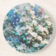 Um conjunto vibrante de flores brancas se coloca em meio a um cenário sonhador de vegetação suave, com pistas de tons azuis e rosados. As órbitas eferlescentes flutuam em torno da flora, acrescentando um toque de choradeira à cena.