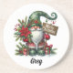 Uma bela imagem de um gnomo segurando flores e um cartaz que diz, "Feliz Natal", aparece nesta porta copos de Férias. A porta copos pode ser personalizada e é feita de arenito com cobertura de cortiça. Feita para manter as mesas livres de arranhões e humidade, use-se ou dê como presente!