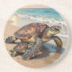 Um porta-copos temático costeiro com uma ilustração de uma mamãe tartaruga marinha e um bebê rastejando para as ondas do oceano azul em uma praia arenosa.