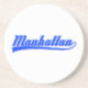 Manhattan, Nova Iorque, escrito com uma haste (cauda). Fontes em branco e azul. Design de texto original.