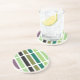 Padrão geométrico linear, retangular, listrado de matizes pretas, roxas e verdes.