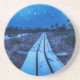 Vista panorâmica de pântanos à noite com caminho de madeira, pequenas lagoas e pinheiros. Caminho de caminhada de madeira que atravessa o pântano contra a lua de cheio e o céu noturno com estrelas.