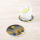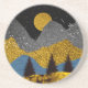 design de paisagem da montanha abstrato em tons de ouro, preto e azul em tons negros, com um luar e pássaros.