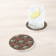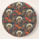 Sandstone coaster with a cool looking owl with a piercing stare. A full moon in the back with a garden of red flowers.