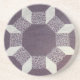 Bloqueio inclinado em padrão "spool" roxo e branco. Oito colheres giram em torno de um centro de roxo escuro. Um impressão de flores roxas é o "fio" na colher. Sem quadro para cada bloco, o padrão produz um efeito caleidoscópio. ***Parte do conjunto bkmAN1a.