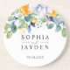 Uma brilhante porta copos de areia de casamentos colorida com lindas folhas botânicas verdes e de cor aquática e folhas de eucalipto e elegantes flores brancas e ensolaradas. Adicione um pouco de sofisticação à decoração do seu casamento com esta elegante porta copos de núpcias amarela floral, branca e azul. Com um design eterno adornado com delicados florais amarelos, florais brancos sutis e sotaques azuis sutis, esta porta copos expele romance e charme. Os detalhes refinados da aquarela e o material de pedra de alta qualidade fazem dele um na moda e um guardião funcional para os hóspedes. Perfeito para casamentos de primavera e verão, festas de jardim ou celebrações do interior, esta porta copos lindamente trabalhada serve como lembrança duradoura de seu dia especial enquanto protege superfícies com elegância.