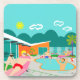 Esta porta copos plástica dura da festa na piscina alegre retro caracteriza quatro beefcakes hunky que têm uma estadia velha alegre enquanto batem o calor do Palm Springs lounging ao redor a água azul de turquesa de sua Bumerangue atômico piscina dada forma. A arquitetura moderna do meio século na casa de pedra fabulosa, alaranjada é claramente bens imobiliários principais, dados a vista das montanhas no fundo. Um sol amarelo do starburst brilha brilhantemente no céu de turquesa assim que você pode ver cada detalhe encantador--dos flamingos kitschy, cor-de-rosa aos anos 50 listrados, cerca ventoso dos blocos. E naturalmente que casa do Palm Springs estaria completa sem uma palmeira?