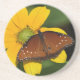 Uma linda borboleta Rainha repousa sobre uma flor amarela brilhante. A flor fornece uma refeição saborosa para a borboleta faminta. Fotografia de Karla Chrast.