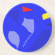 Essa porta copos de arenito exibe uma imagem de fundo azul elétrico, da qual saem folhas azuis, laranja, marinho e amarelas.
