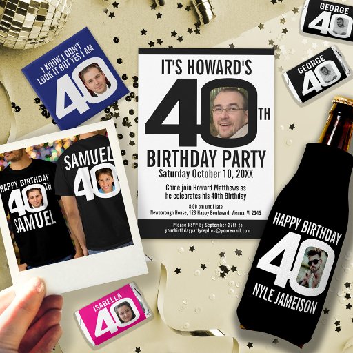 aniversário de 40 anos preto e branco refrigerador de festas fotográficas. Excelente de adicionar um toque pessoal a uma surpreendente quadragésima festa de aniversário. Personalize com sua foto de aniversários de meninos ou meninas no 0 de 40 e personalize com sua escolha de nome. Projetada por Sarah Trett para www.mylittleeden.com