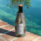 Refrigerante de garrafa com um desenho abstrato com um padrão mineral geodo agado. espirais Douradas, cinzas, brancas e pretas formando ondas de cor elegantes. Um quadrado de cinza leve com uma borda fina e preta colocada sobre cima com o seu dentro de texto. elegância na moda moderna.