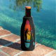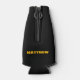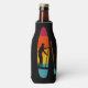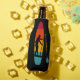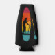 Crie um presente personalizado que seja perfeito para se erguer com as velas. Esta manga de garrafa ou o invólucro de garrafa apresentam uma ilustração de um SUP ou de um conselho de remo e remo rebatíveis em cores vibrantes do pôr do sol com uma ilustração da silhueta a preto de um remo. O gráfico é colocado sobre um fundo preto com um ponto no verso para adicionar um nome em letras amarelas.