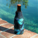 Duas libélulas transparentes, luminosas, turquesas, desenhadas artisticamente sobre fundo noturno, com algas e vagalumes luminescentes do lago. Dragonfly brilhante.
