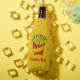 Ilustração de desenho animado de um pequeno pacote de batatas fritas em um plano de fundo amarelo de comida de lixo sem costura. Texto personalizado.