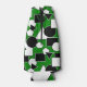 Este refrigerador de garrafas tem um design de Bauhaus de triângulos, círculos, retângulos e pentágonos em preto e branco num campo de verde.