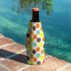 Este refrigerador de garrafas tem um design geométrico de pontos azuis, laranja, amarelo e castanho.