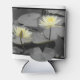 Esta imagem fora do quadro apresenta dois lírios de água delicados em matizes macios, amarelo-pálidos, destacando-se claramente contra um pano de fundo de almofadas, lírios cinza e água. As flores estendem-se para além do quadro delimitado por preto, criando um efeito dinâmico, quase tridimensional. O contraste entre os florescentes vibrantes e os subjugados arredores destaca a delicada beleza e tranquilidade da cena, evocando um senso de calma e elegância silenciosa.