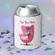 Este refrigerador de latas ou garrafas tem um gato bonito, um preto branco sentado numa cadeira cor-de-rosa meio século sobre fundo branco com bolinhas cor-de-rosa. Personalize seu texto na frente e atrás com o modelo.