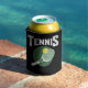 Design de texto "Tênis" com gradação de estilo retrorreflector com bolas de tênis amarelas e verdes e decoração de raquete