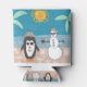 Snowman e pinguins de férias na praia. O que poderia ser mais divertido?