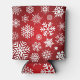 Uma lata mais fria com fundo vermelho e flocos de neve brancos e estrelas. Os flocos de neve têm diferentes tamanhos e formas, e estão espalhados por toda a lata mais fria. As estrelas também são brancas e menores que os flocos de neve. O refrigerador é feito de um material macio e flexível.